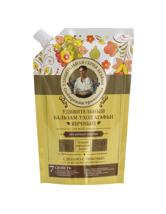 РЕЦЕПТЫ БАБУШКИ АГАФЬИ УДИВИТЕЛЬНАЯ СЕРИЯ АГАФЬИ - ЯИЧНЫЙ Удивительный бальзам-уход Агафьи для волос для всей семьи 500 мл. (дой-пак)