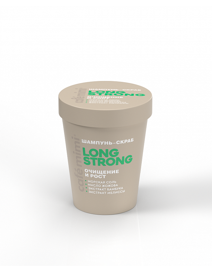 CAFE MIMI LONG STRONG Шампунь-скраб "Очищение и рост" с морской солью, маслом жожоба, экстрактом бамбука и мелиссы 310 г.