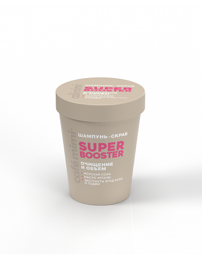CAFE MIMI SUPER BOOSTER Шампунь-скраб "Очищение и объем" с морской солью, маслом арганы, экстрактами ягод асаи и годжи 310 г.