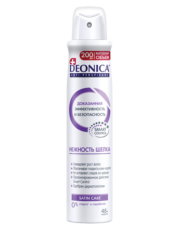 Современный антиперспирант DEONICA НЕЖНОСТЬ ШЕЛКА благодаря входящему в состав натуральному экстракту замедляет рост нежелательных волос и обеспечивает надежную защиту и свежесть на 48 часов. После применения антиперспиранта на протяжении месяца новые волоски начинают расти медленнее, становятся тоньше, а при условии регулярной эпиляции приобретают округлые края.