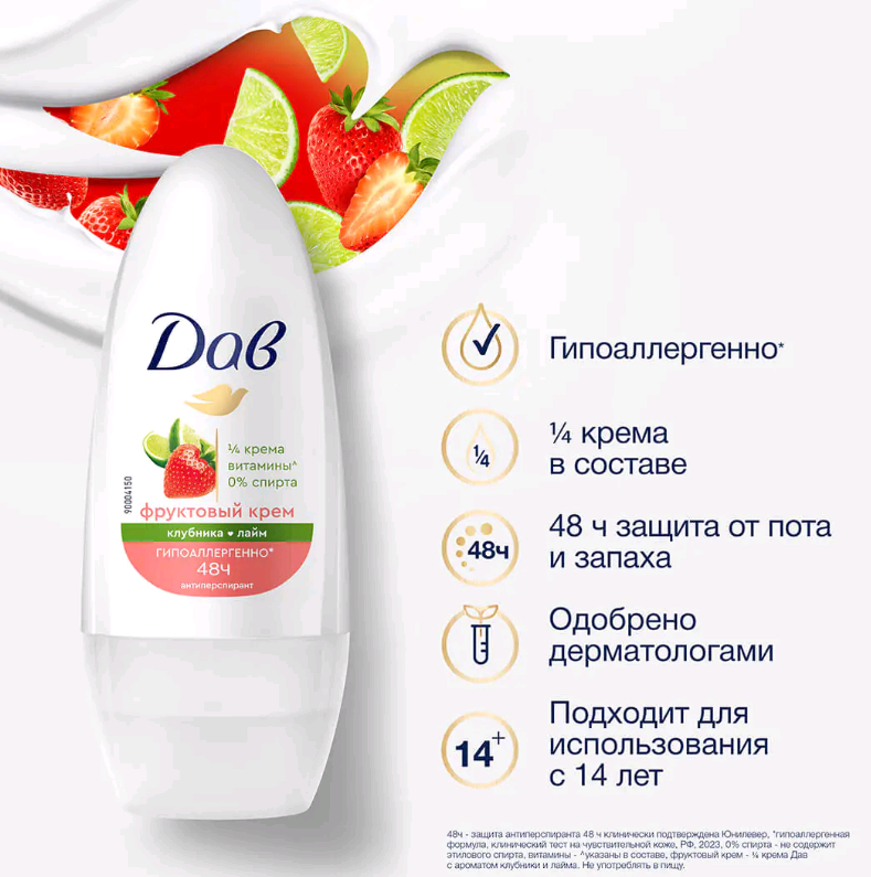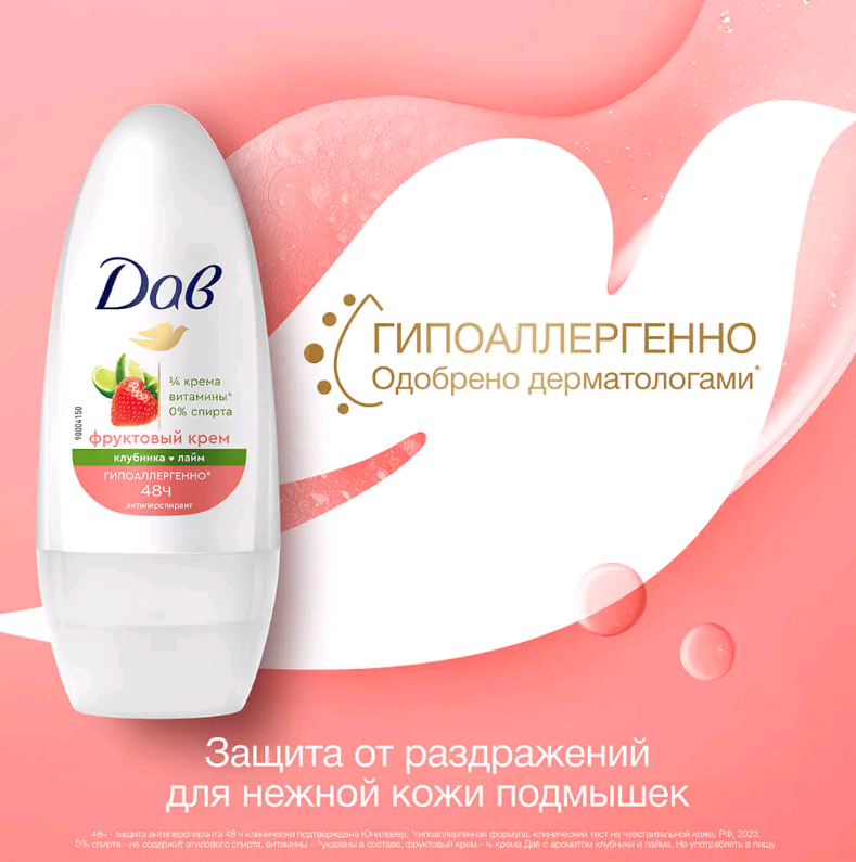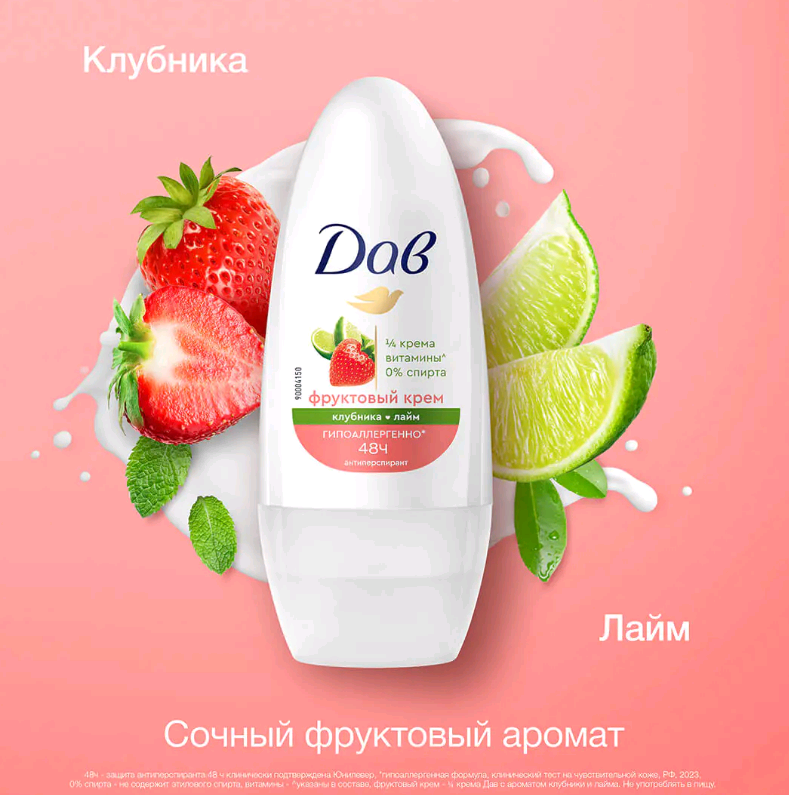 ДАВ ФРУКТОВЫЙ КРЕМ - КЛУБНИКА-ЛАЙМ Дезодорант-антиперспирант роликовый 50 мл.