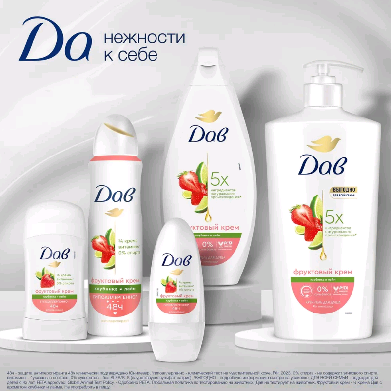 Добавьте летнее настроение в каждый день вместе с Дав – шариковым антиперспирантом "Клубника-лайм". Он обеспечивает надежную защиту от пота и неприятных запахов до 48 часов, при этом бережно заботится о нежной коже подмышек.