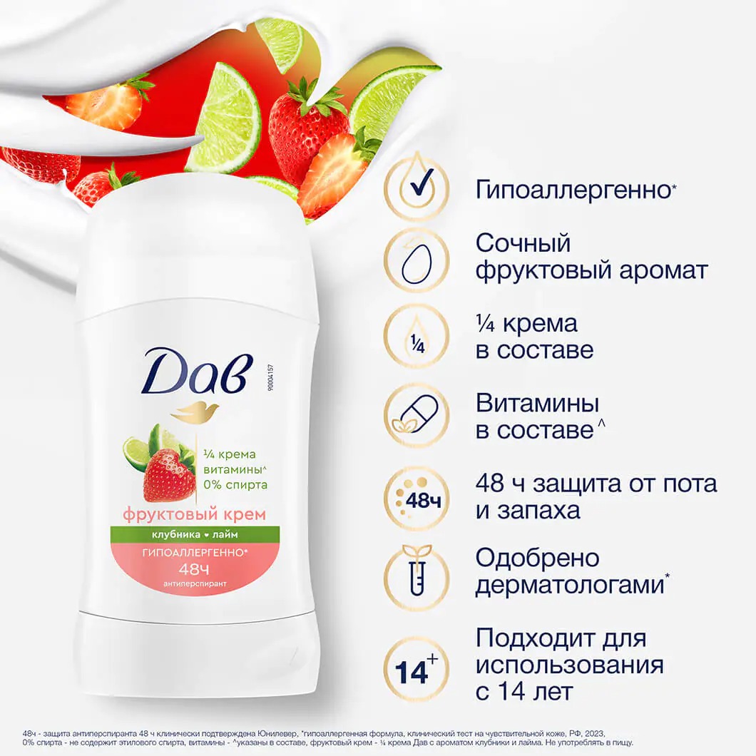 ДАВ ФРУКТОВЫЙ КРЕМ - КЛУБНИКА-ЛАЙМ Дезодорант-антиперспирант-стик 40 мл.
