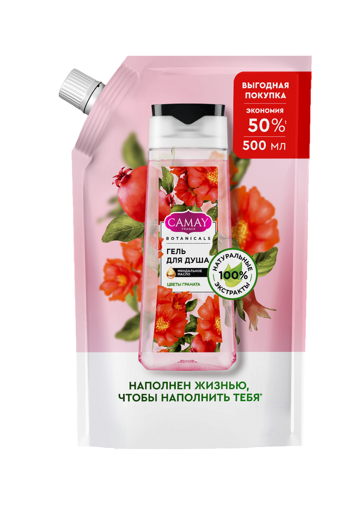 Каждый твой день — это активное движение к цели и саморазвитие. В этой гонке сложно притормозить, чтобы восстановить физические и эмоциональные силы. С гелем для душа Camay Botanicals Цветы Граната ты сможешь уделить время себе и восполнить энергию!