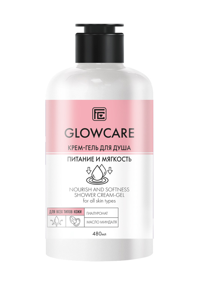 FAMILY COSMETICS GLOWCARE - ПИТАНИЕ И МЯГКОСТЬ Крем-гель для душа "С гиалуронатом и маслом миндаля" для всех типов кожи 480 мл.