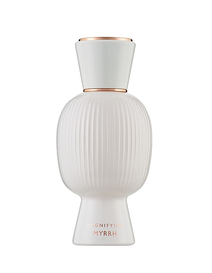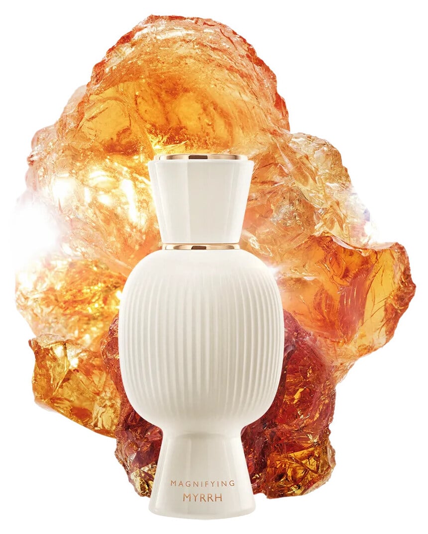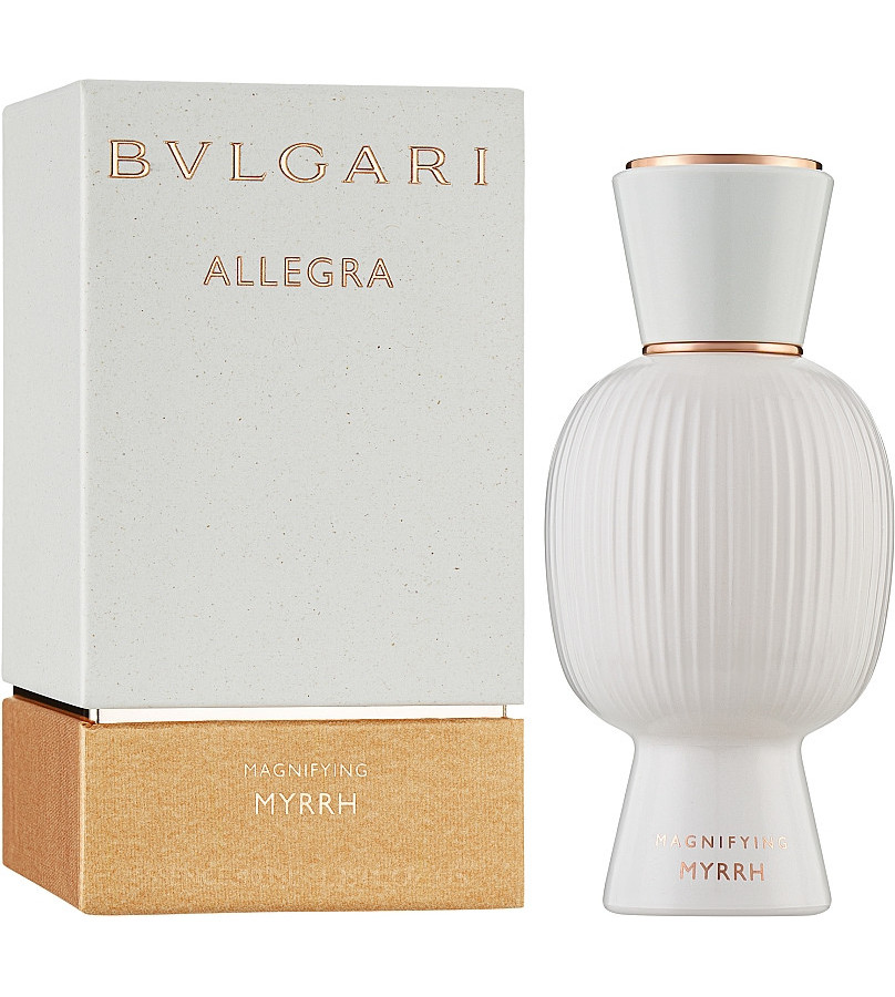 Bvlgari Allegra Magnifying Myrrh Essence - необычный аромат от итальянского бренда, который появился в 2022 году и разработан парфюмером Жаком Кавалье. Является частью линейки Bvlgari Allegra. Ее особенность - несколько парфюмов, который можно персонализировать с помощью нишевых эссенций, с преобладанием только одного или двух компонентов. Так, Allegra Magnifying Myrrh Essence - это квинтэссенция мирры и белой амбры. Высококонцентрированная, ее аромат сильный и яркий, эксклюзивный. На первый взгляд - обманчиво простой, но при дальнейшем знакомстве раскрывается в уточненном сиянии, становится выразительным, ослепительным и эмоциональным, в четкости отражая национальный характер Италии. Теплая и знойная жидкость состоит из драгоценных, специально подобранных ингредиентов: мирры и белой амбры. Они исключительно натурального происхождения. Мирра обладает интенсивным, бальзамическим, сладковато-пряным запахом. Белая амбра - сладковато-мускусная, насыщенная и теплая. Эссенцию можно носить сольно, но парфюмеры Bvlgari рекомендуют смешивать несколько капель с одним из парфюмов Allegra Magnifying, чтобы получить новые ольфакторные впечатления и создавать уникальные шлейфы. Лаконичный, снежно-белый непрозрачный флакон, в котором находится аромат Bvlgari Allegra Magnifying Myrrh Essence соответствует его композиции, в которой нет ничего лишнего.