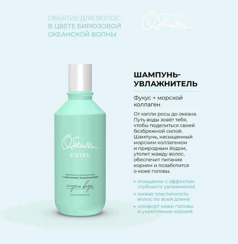 Увлажняющий шампунь для волос Обними "Путь воды" с фукусом и морским коллагеном - от капли росы до океана. Путь воды зовёт тебя, чтобы поделиться своей безбрежной силой. Шампунь Estel Обними - это профессиональная уходовая косметика, которая призвана удовлетворить потребности самых требовательных клиентов.