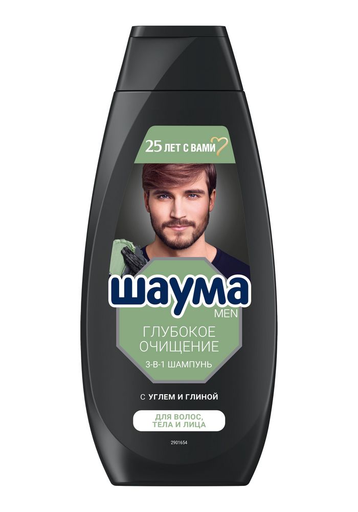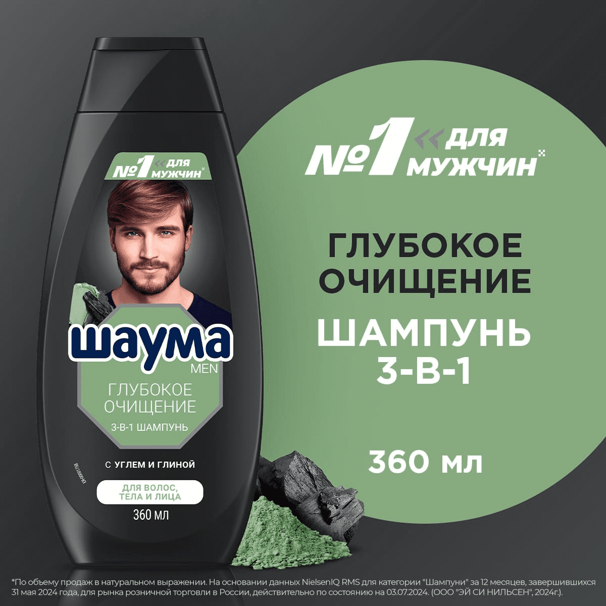 ШАУМА MEN - ГЛУБОКОЕ ОЧИЩЕНИЕ 3-в-1 Шампунь для волос, тела и лица "С углем и глиной" 360 мл.