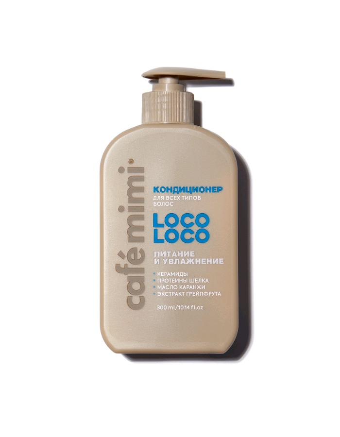 CAFE MIMI LOCO LOCO Кондиционер для всех типов волос "Питание и увлажнение" с керамидами, протеинами шелка, маслом каранжи, грейпфрутом 300 мл.