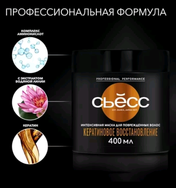 Маска Сьёсс "Кератиновое восстановление" для поврежденных волос: - Восстанавливает волосы на молекулярном уровне. - Укрепляет волосы и снижает ломкость. - Запечатывает секущиеся кончики. - Глубоко питает и наполняет силой. - Защищает от будущих повреждений. - Высокая концентрация активных компонентов.