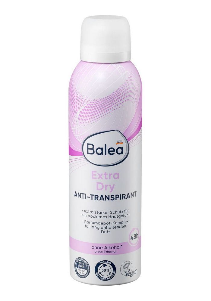 Дезодорант-антиперспирант Balea Extra Dry обеспечивает надежную защиту от пота продолжительностью до 48 часов. Преимущества этого спрея: отсутствие спирта и других агрессивных компонентов в составе, нормализация работы сальных желез, отсутствие следов на одежде после использования. Уникальная формула бережно ухаживает за кожей. Дезодорант прошел дерматологическое тестирование. Имеет деликатный кремовый аромат. Регулярное использование позволяет оставаться уверенной в себе даже в стрессовых ситуациях!