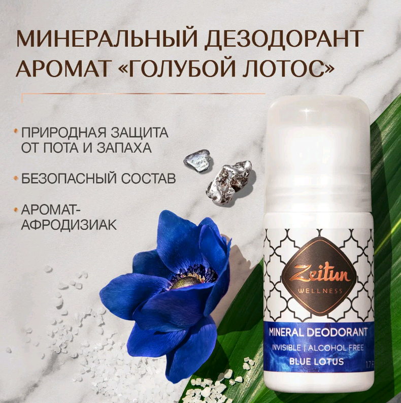 Проявите свою индивидуальность с самым уникальным ароматом минерального шарикового дезодоранта Zeitun "Голубой лотос"!