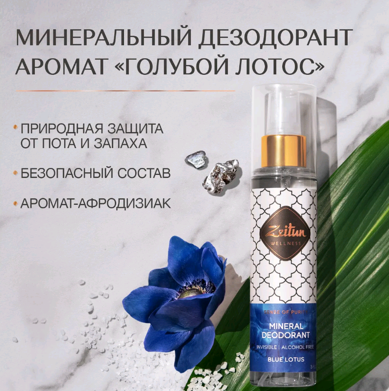 ZEITUN MINERAL DEODORANT - BLUE LOTUS Минеральный дезодорант-антиперспирант-спрей "Голубой лотос" 150 мл. (351241)