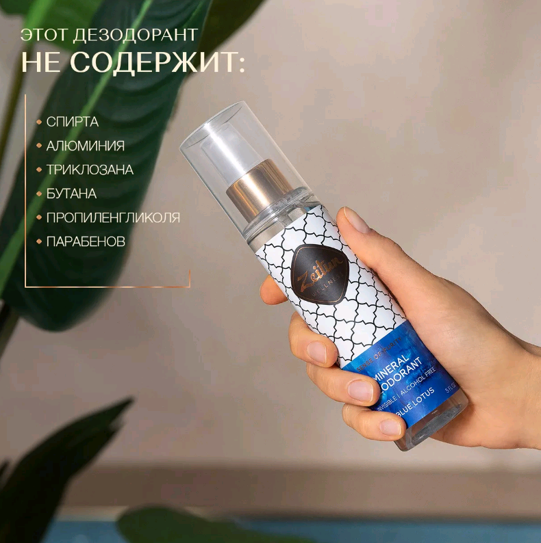 Минеральный спрей-антиперспирант Zeitun "Голубой лотос" с натуральными квасцами, коллоидным серебром и арабской парфюмерной композицией объединяет эффективность природной защиты и изысканность тонкого цветочного аромата. Он нейтрализует бактерии и неприятный запах на весь день, снижает обильное потоотделение естественным образом, не забивая поры и не блокируя потовые железы. Смягчает, увлажняет, оставляет на коже изысканный аромат голубого лотоса. Не оставляет следов на коже и одежде, обеспечивает гигиеничное нанесение. Натуральная формула дезодоранта безвредна для здоровья и окружающей среды.