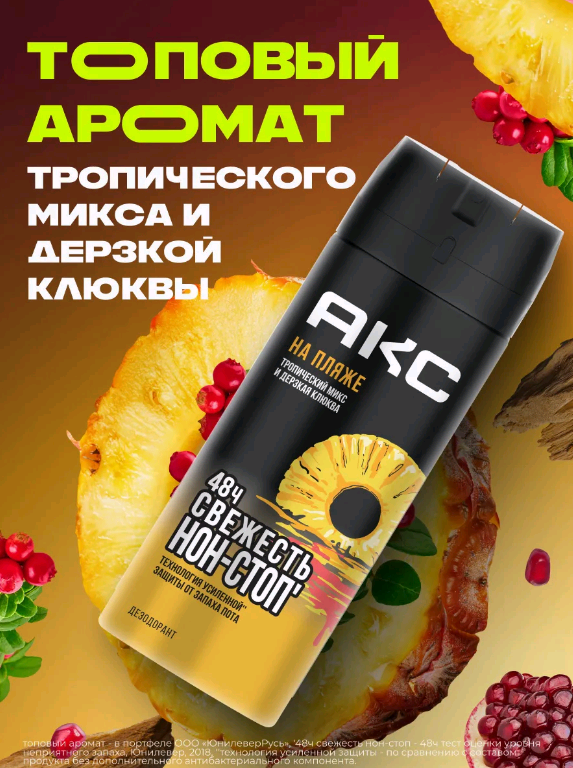 Дезодорант имеет яркий фруктовый аромат, на создание которого вдохновил известный хит - популярный тропический коктейль. Невероятно притягательные ноты клюквы, сочного ананаса и яркого апельсина передали новому аромату Акс свой страстный головокружительный характер.