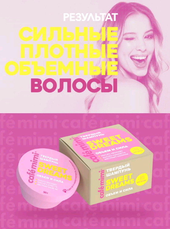 Твердый шампунь Cafe Mimi Sweet Dreams обладает концентрированной формулой, глубоко и бережно очищает волосы и кожу головы, придает тонким волосам плотность и видимый объем без утяжеления. Подходит для тонких волос.