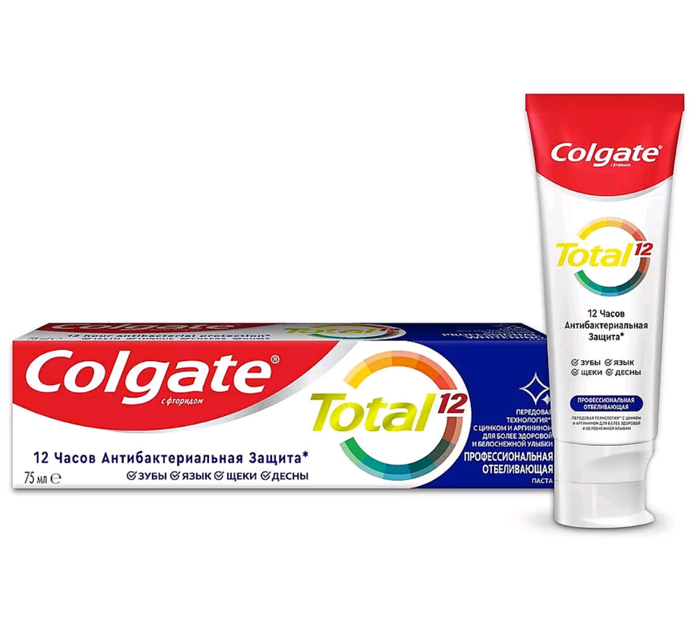 Уверенная и привлекательная улыбка начинается с белоснежных зубов и здоровья всей полости рта. Поэтому передовая формула Colgate Total 12 "Профессиональная Отбеливающая" помогает не только бороться с потемнениями на эмали, но также борется с бактериями на зубах, языке, щеках и деснах в течение 12 часов, обеспечивая здоровье всей полости рта.