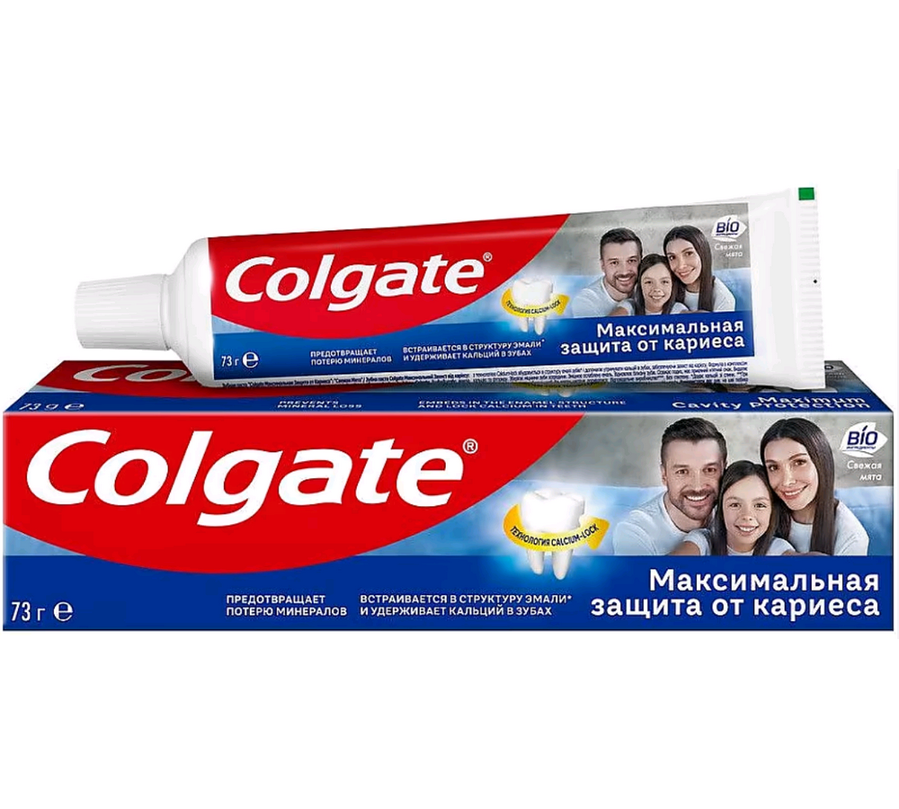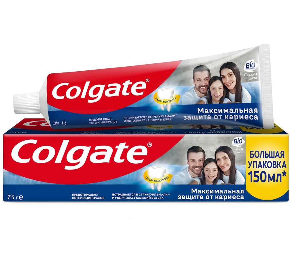 Зубная паста Colgate Максимальная защита от кариеса - Свежая мята с комплексом кальция и фторида и технологий Calcium-lock встраивается в структуру эмали зубов и помогает удерживать кальций в зубах, обеспечивая защиту от кариеса.