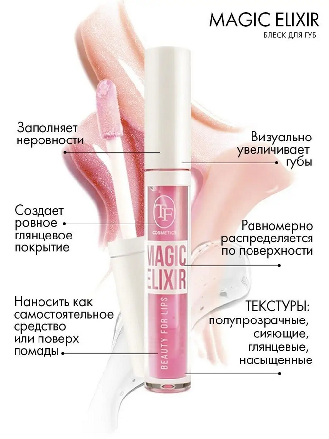 Блеск для губ Magic Elixir от TF Cosmetics - это идеальный выбор для тех, кто хочет подчеркнуть свою красоту и добавить губам сияния и объема. Благодаря инновационной формуле, блеск обеспечивает непревзойденное увлажнение и уход за губами. Визуально увеличивает объем губ. Имеет легкую текстуру. Комфортно распределяется по губам, не скатывается и не липнет. Увлажняет губы и придает сияние.