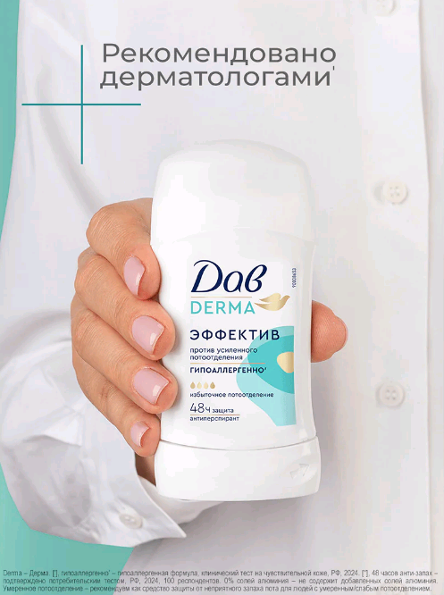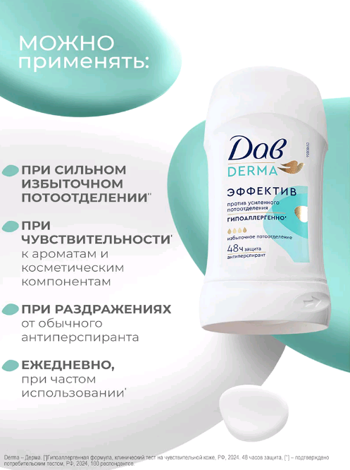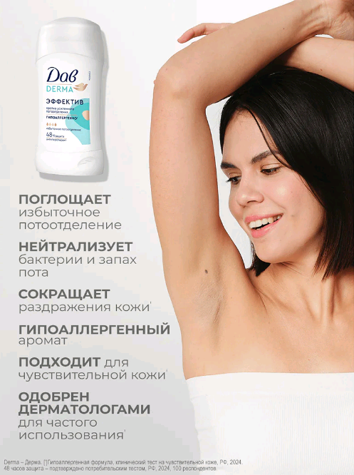 Гипоаллергенный дезодорант-стик Дав Derma Эффектив создан специально для женщин и девочек-подростков. Интенсивный дезодорант обеспечивает надежную защиту от запаха и от повышенного потоотделения. Формула продукта включает в себя бережные, но активные компоненты, которые успешно справляются с излишней влагой и запахом пота. Дезодорант-стик, содержащий 0% спирта и обогащенный ниацинамидом и минералами, защитит от усиленного потоотделения на 48 часов без раздражения кожи и липкости. Гипоаллергенный состав не вызывает раздражения, что делает его отличным выбором для чувствительной кожи.