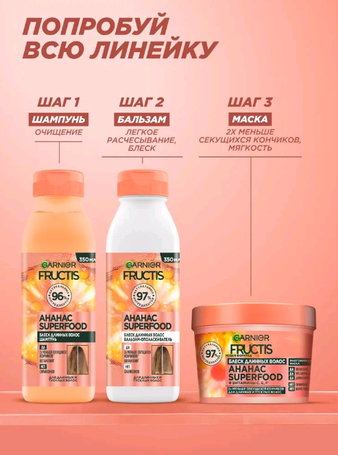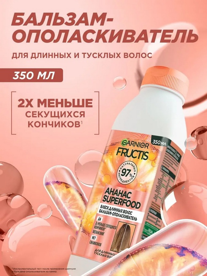 GARNIER FRUCTIS - АНАНАС SUPERFOOD Бальзам-ополаскиватель "Блеск длинных волос" для длинных и тусклых волос 350 мл.