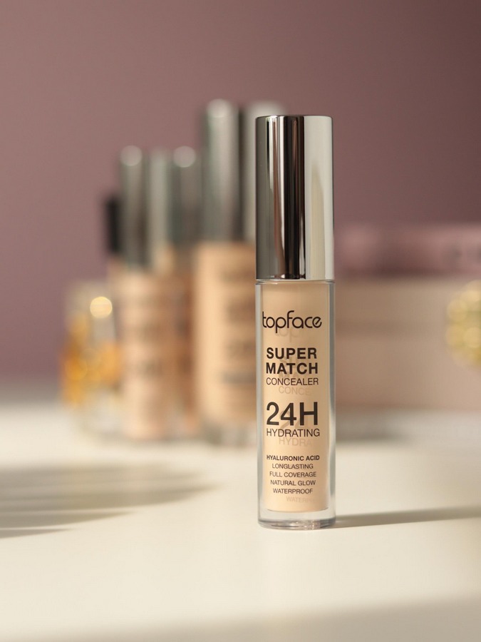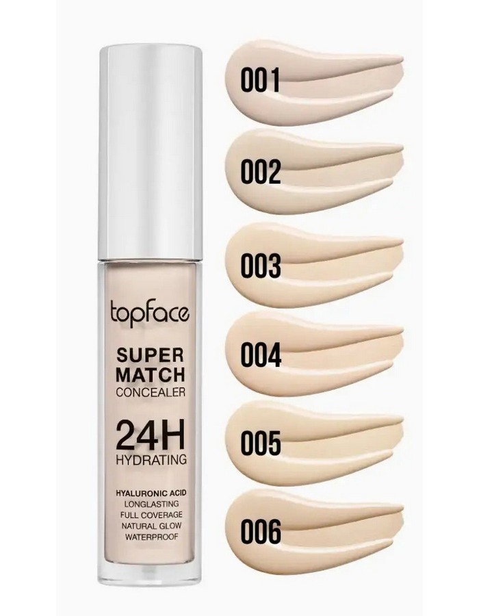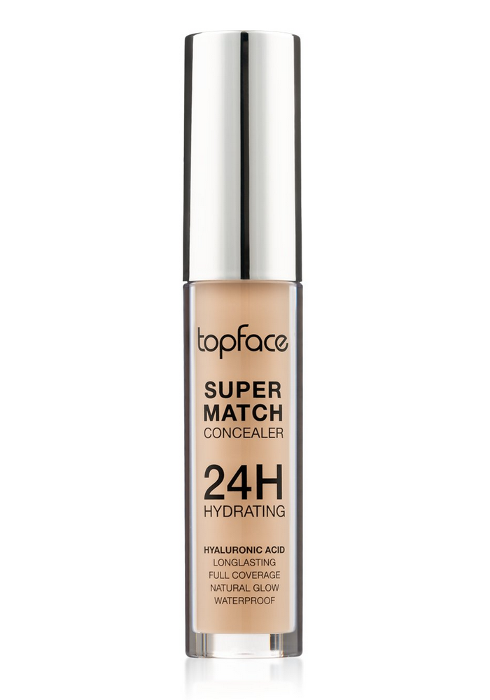 TopFace Super Match Concealer 24H Hydrating - лёгкий кремообразный жидкий консилер, специально разработанный для идеальной маскировки кругов под глазами, дефектов кожи и пигментных пятен. Его формула легко растушевывается и идеально сливается с кожей, создавая естественный и ровный финиш. Плотное покрытие выравнивает тон лица, обеспечивая 24-часовое увлажнение.