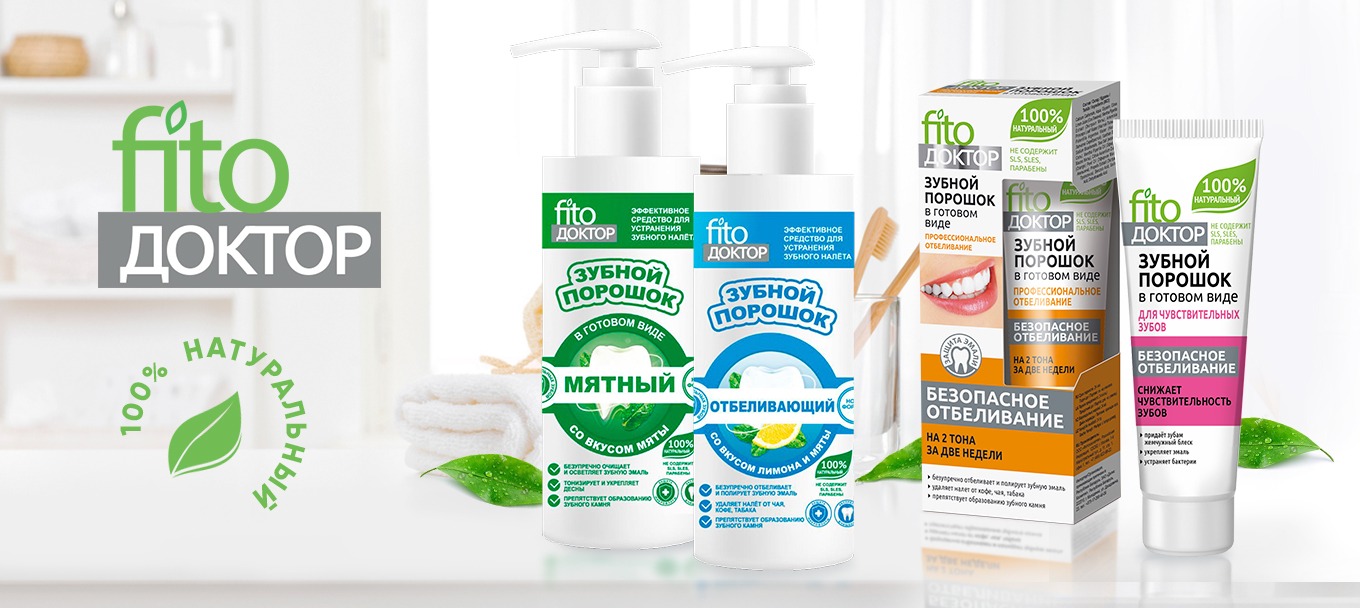 Зубной порошок в готовом виде Fito Доктор – инновационный прорыв в сфере ухода за зубами! Уникальная рецептура порошка имеет нежную, сбалансированную консистенцию и позволяет профессионально и безопасно отбелить зубы на 2 тона за две недели ежедневного применения.