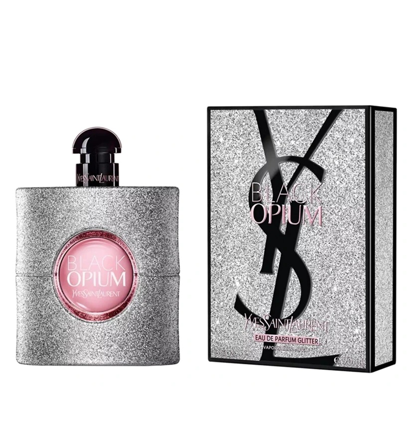 Флакон парфюма Yves Saint Laurent Black Opium Glitter украшен серебристым глиттером, отражающим праздничную природу аромата. Его гладкая форма сохраняет фирменное круглое окошко в центре, предлагая проблеск ароматической жидкости внутри. Дизайн отражает двойственность аромата — мягкость в паре со смелостью, сладость с оттенком резкости. Этот визуально яркий дизайн создан для воплощения энергии гламурных вечеринок.