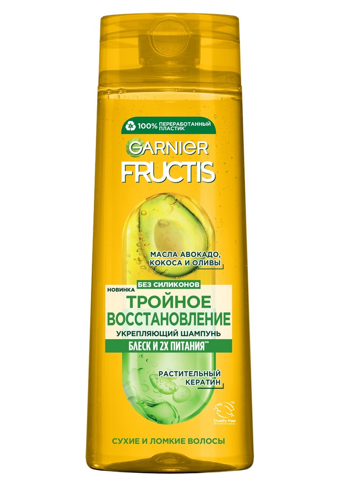 Шампунь Garnier Fructis "Тройное восстановление" с тремя маслами и триглицеридом помогает избавиться от сухости и ломкости волос, вернуть локонам гладкость и шелковистость. 3 вида растительных масел: авокадо, карите и оливы, а также триглицерид питают, восстанавливают и смягчают поврежденные волосы. Активный концентрат фруктов и витамины B3 и B6 оказывают укрепляющее действие: волосы растут более сильными и блестящими.