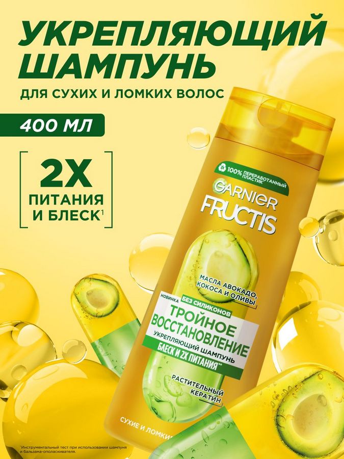 GARNIER FRUCTIS - ТРОЙНОЕ ВОССТАНОВЛЕНИЕ Укрепляющий шампунь "Масла авокадо, кокоса, оливы и растительный кератин" для сухих и ломких волос 400 мл.