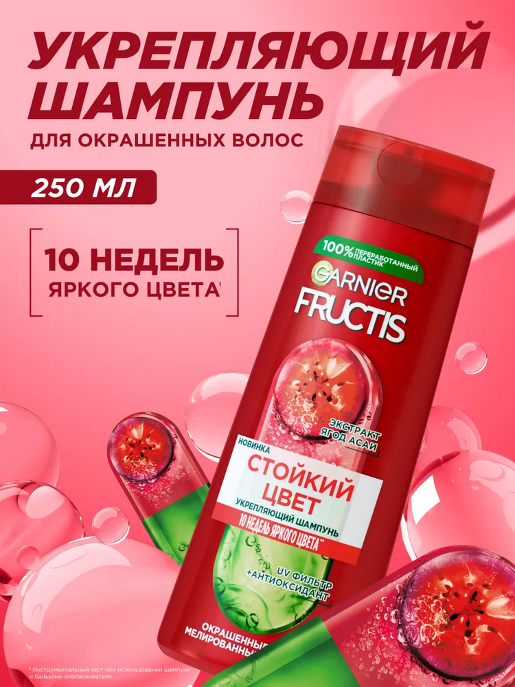 Шампунь для окрашенных и мелированных волос Fructis Стойкий цвет от Garnier помогает восстановить волосы от повреждений, вызванных окрашиванием, защитить цвет от вымывания и продлить блеск. Формула с экстрактом ягод асаи и полифенолами нейтрализует действие свободных радикалов, препятствует потере насыщенности цвета и блеска волос. Волосы выглядят яркими и сияющими до 10 недель. Активный концентрат фруктов в составе способствует росту более сильных, плотных и блестящих волос.