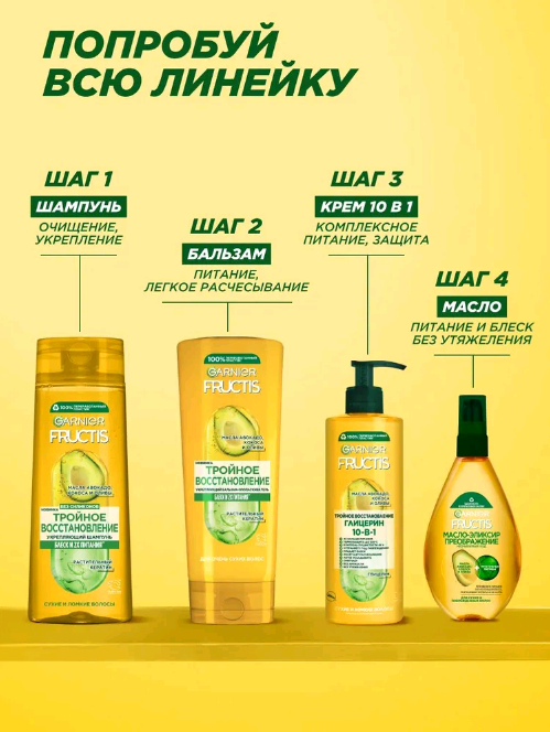 Для достижения оптимального эффекта используйте всю линейку средств для укрепления волос Fructis Тройное Восстановление.