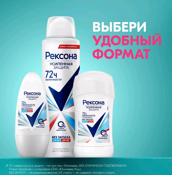Двигайся с комфортом и наслаждайся каждым днем. Прогулочный шаг, неспешная пробежка, спринтерский бег - тебе все по плечу, ведь мы позаботились о твоей защите. Чем бы вы ни занимались, вы будете чувствовать только комфорт. Покоряете ли вы новую вершину, спешите ли на автобус, выступаете ли с докладом или идете на свидание, будьте уверены, вы надежно защищены от пота и запаха - что бы вы ни запланировали, у Рексона есть решение! Наши продукты работают так же эффективно, как и вы. Мы стремимся узнать о поте как можно больше, чтобы затем использовать полученные знания для создания инновационных формул наших продуктов. Будьте уверены, Рексона никогда не подведет!
