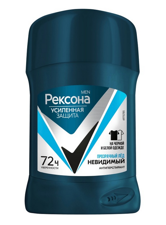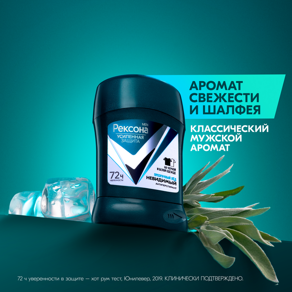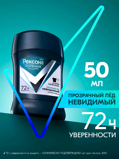 РЕКСОНА (50) MEN - УСИЛЕННАЯ ЗАЩИТА - ПРОЗРАЧНЫЙ ЛЕД Дезодорант-антиперспирант-стик "Невидимый на черной и белой одежеде" 50 мл.