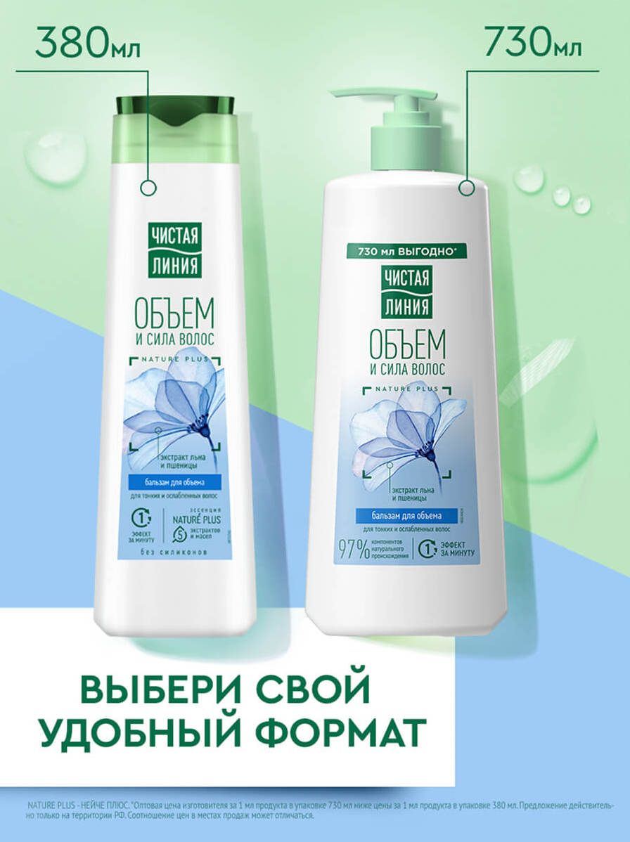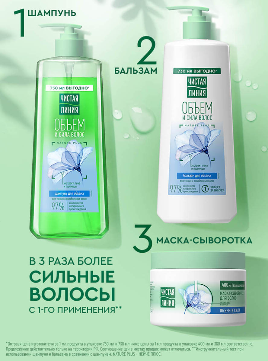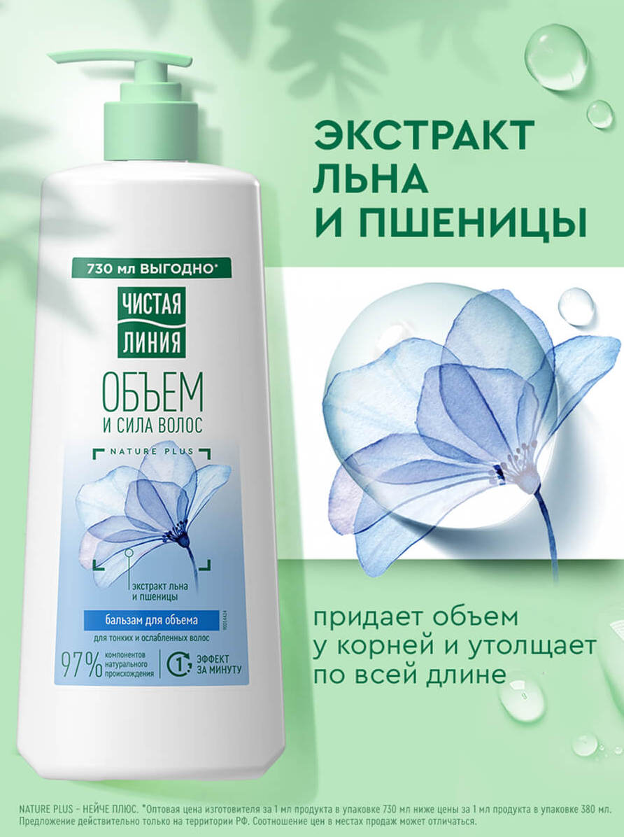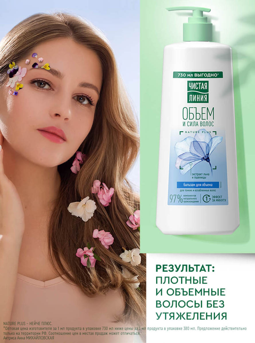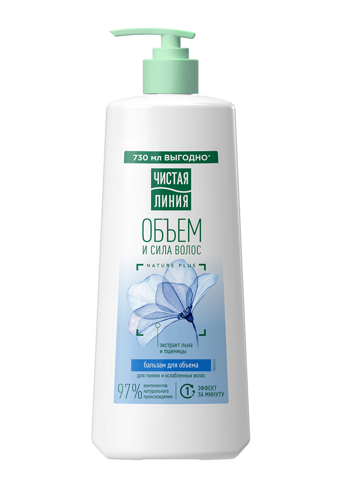 ЧИСТАЯ ЛИНИЯ ОБЪЕМ И СИЛА ВОЛОС Бальзам для объема для тонких и ослабленных волос "С экстрактом льна и пшеницы" 730 мл.