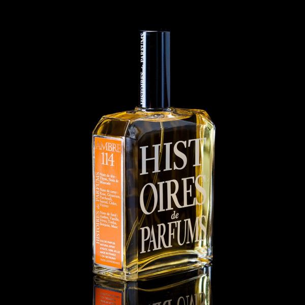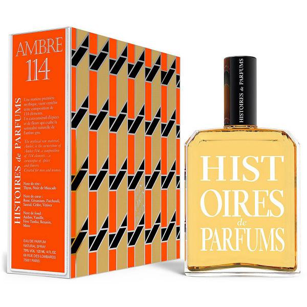 Мощный пряный аккорд на вершине пирамиды Histoires De Parfums Ambre 114, состоящий из нот мускатного ореха и тмина, плавно переходит в древесное сердце. Благородные ноты сандала, смолисто-терпкий пачули, ветивер и белый кедр дополнены изысканным благоуханием роз и свежестью герани. Завершающие аккорды композиции наполнены воздушной сладостью ванили, бобов тонка и смолистого бензоина, нежной чувственностью мускуса и амбры.