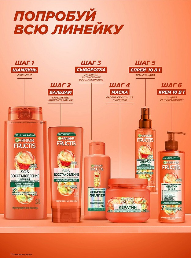 Комплексный несмываемый крем Fructis «SOS Восстановление Кератин 10 в 1» для поврежденных и секущихся волос имеет уникальную формулу с амино-кератином и маслом амлы. Действует в 10 направлениях: восстанавливает, интенсивно питает, защищает от высоких температур до 230С при укладке, обеспечивает защиту от ломкости и химических повреждений, разглаживает поверхность волоса, смягчает, укрепляет, придает блеск. Несмываемое средство не утяжеляет волосы и подходит для ежедневного использования.