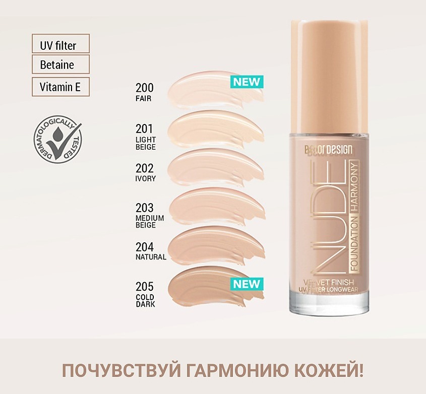 BELORDESIGN NUDE HARMONY - FOUNDATION Тональный крем для лица с витамином Е и UV-фильтром 33 г. №201 light beige