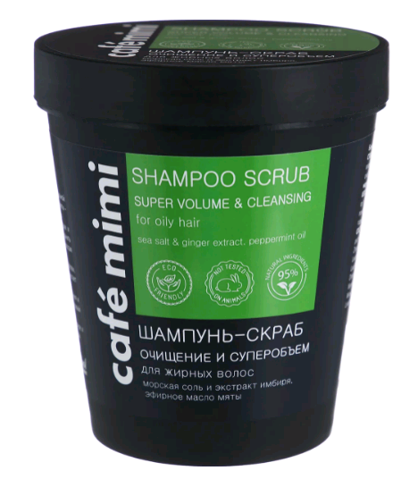 Шампунь-скраб "Очищение и Суперобъем" Cafe Mimi содержит более 50% натуральной морской соли, экстракт имбиря и эфирное масло мяты – настоящий детокс-уход за волосами и кожей головы. Натуральные ингредиенты с активными очищающими и массажными действиями помогут надолго сохранить ощущение чистоты и свежести, придадут волосам дополнительный объем.