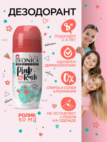 DEONICA FOR TEENS - PINK RUSH Дезодорант роликовый без спирта 50 мл. (для девочек)