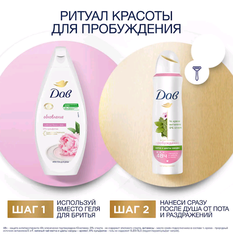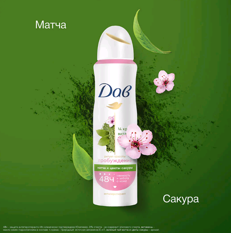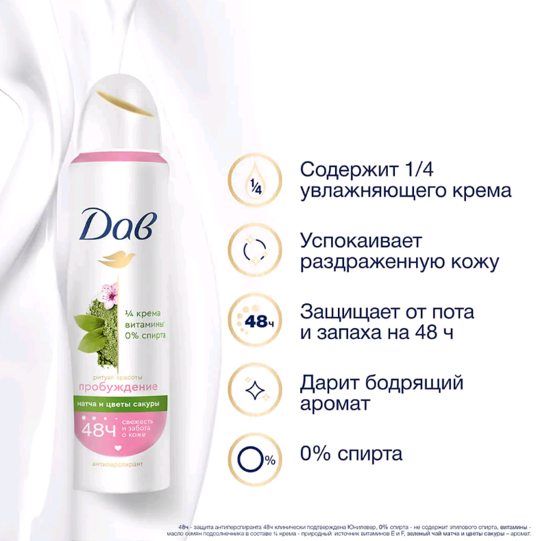Откройте для себя аромат зеленого чая матча и цветка сакуры, вдохновленный ритуалами японских женщин, с антиперспирантом Дав Ритуал Красоты Пробуждение! Этот бодрящий аромат напоминает вкус и аромат пробуждающего зеленого чая матча, а ноты цветка сакуры как будто переносят нас в Японию. Особая мягкая формула без спирта, содержащая ? увлажняющего крема, cпособствует бережному восстановлению кожи после бритья и обеспечивает эффективную защиту от пота и запаха на 48 часов.