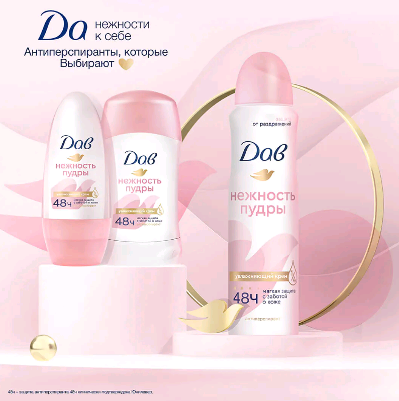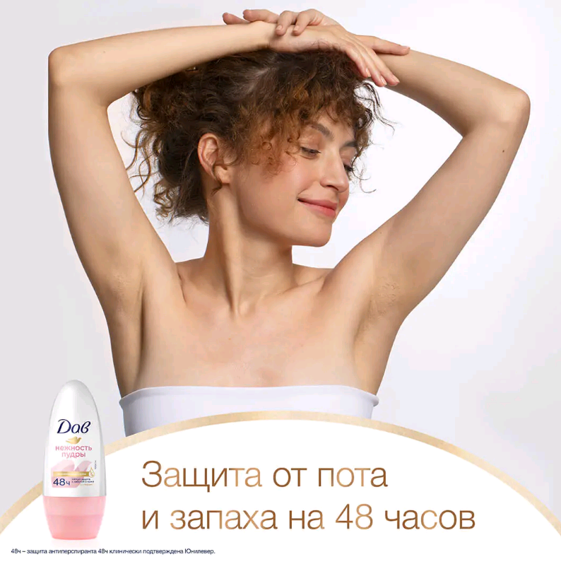 Наслаждайтесь ощущением нежной кожи подмышек и успокаивающим пудровым ароматом с роликовым антиперспирантом Дав "Нежность пудры".